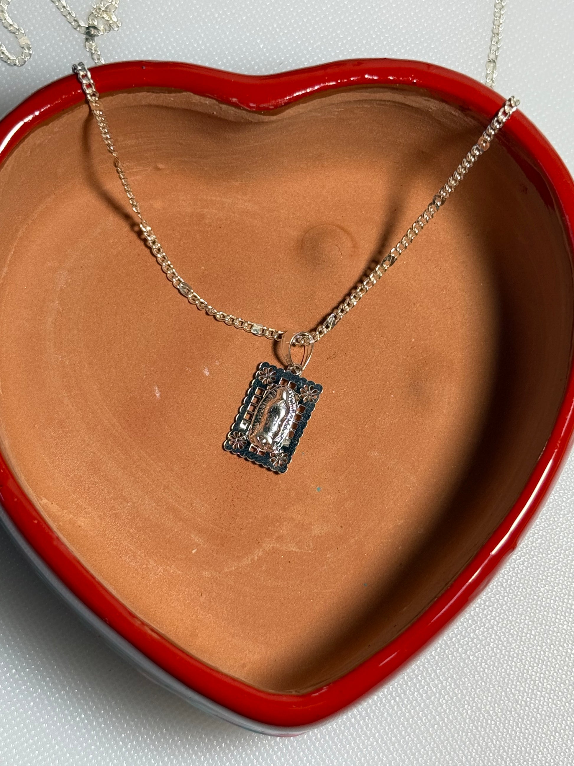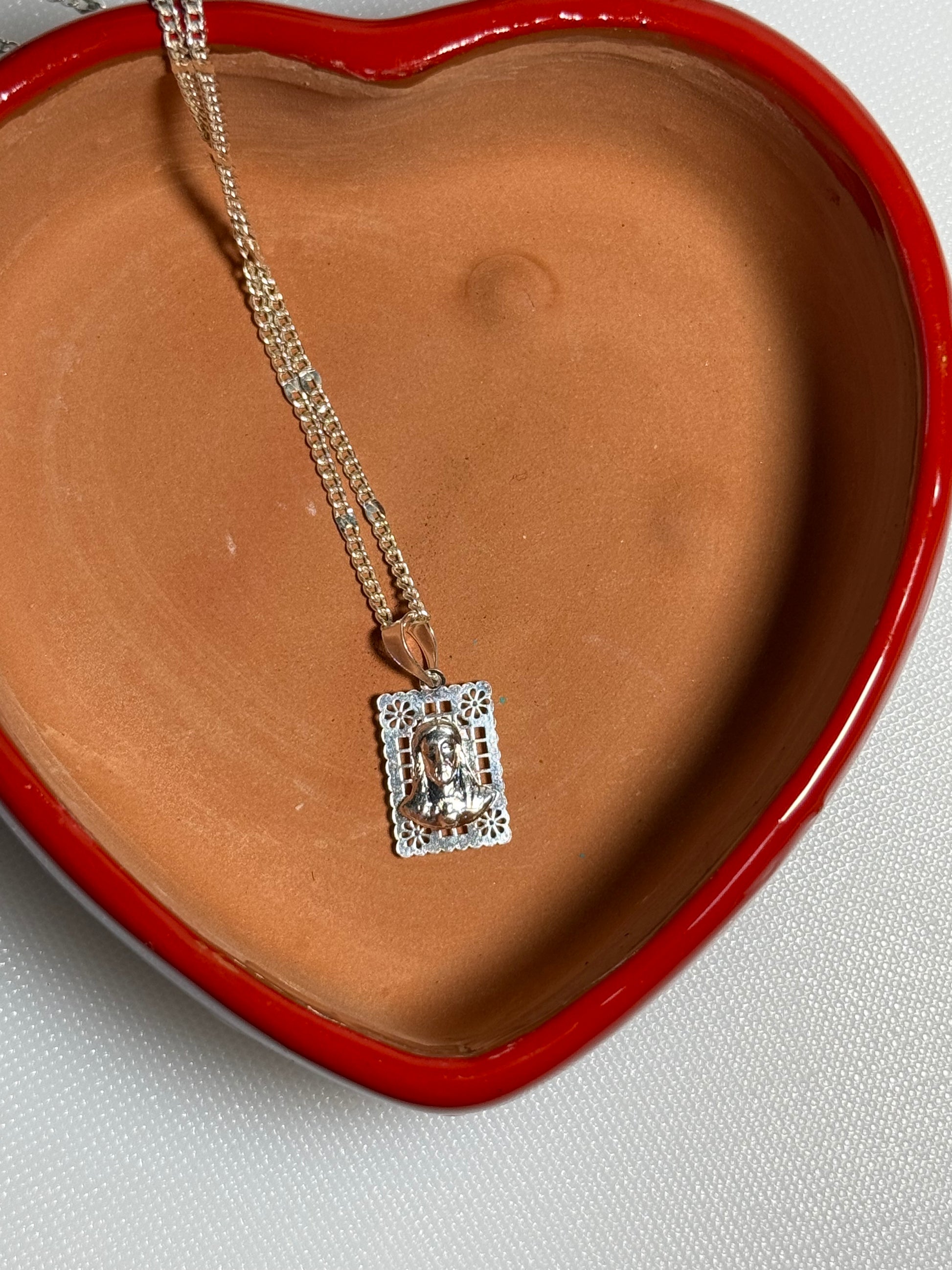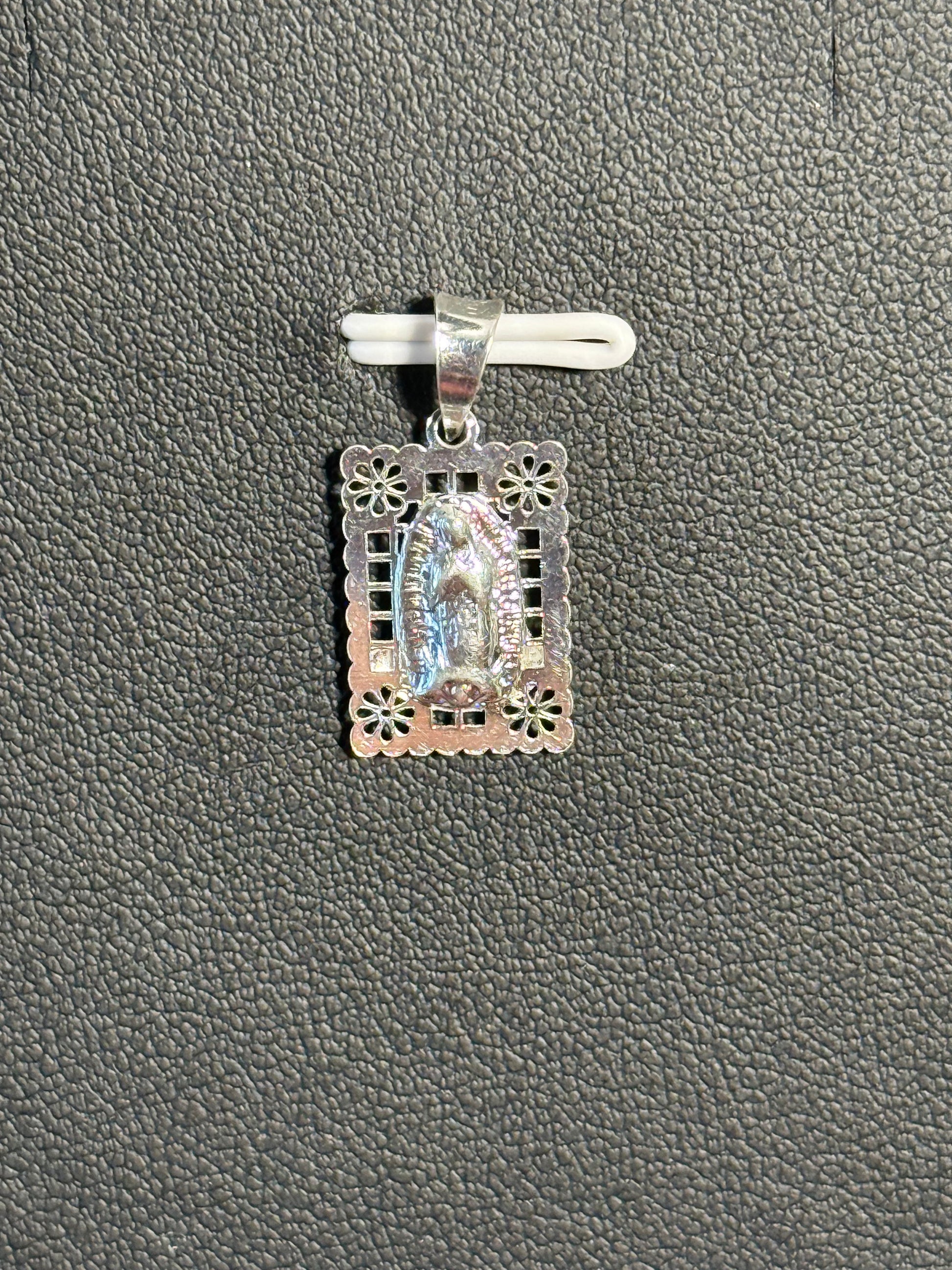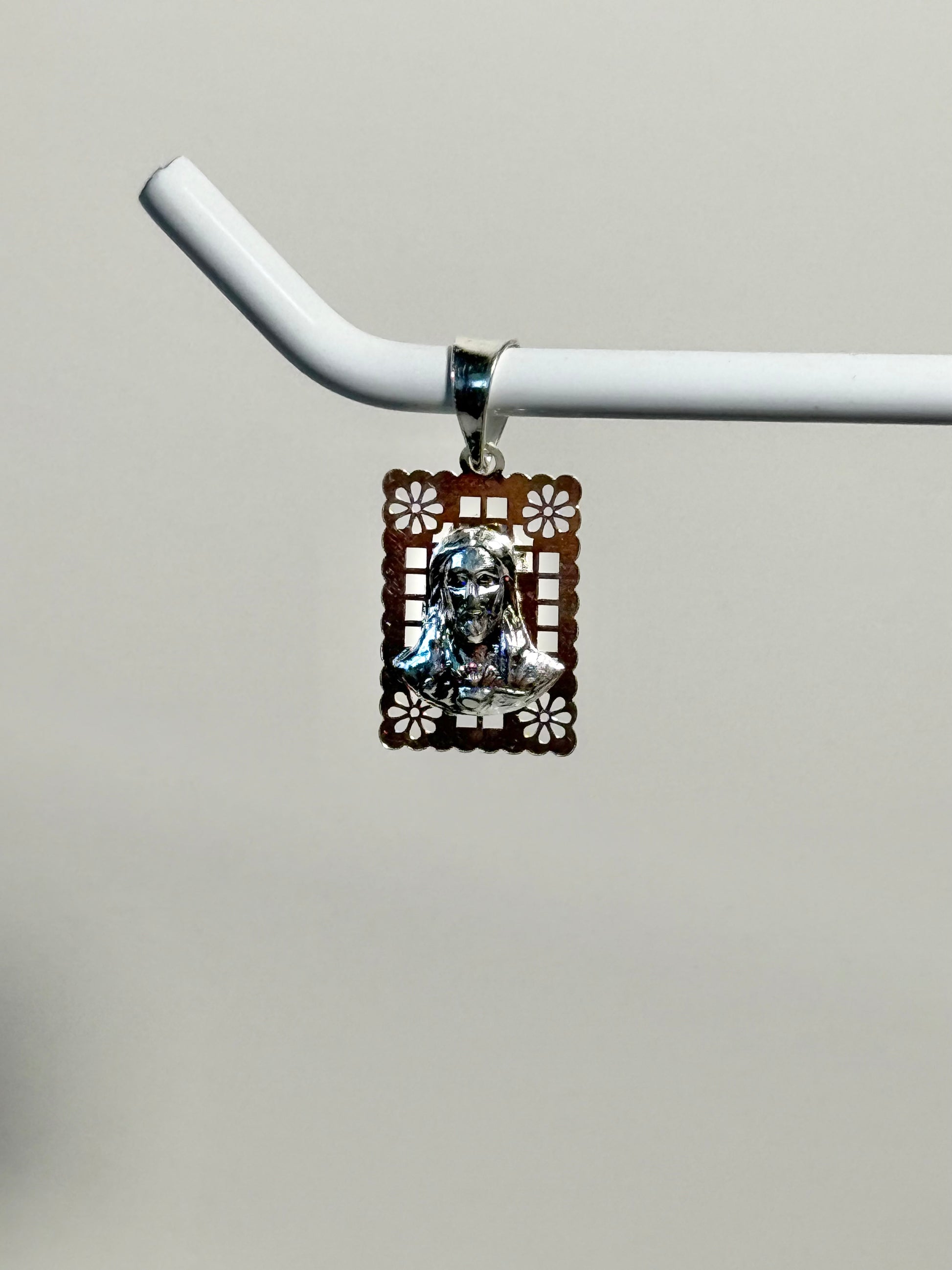 A perfect Mexican themed mini pendant with Virgin Mary and Jesus. This double sided pendant is on beautifully crafted on papel picado.