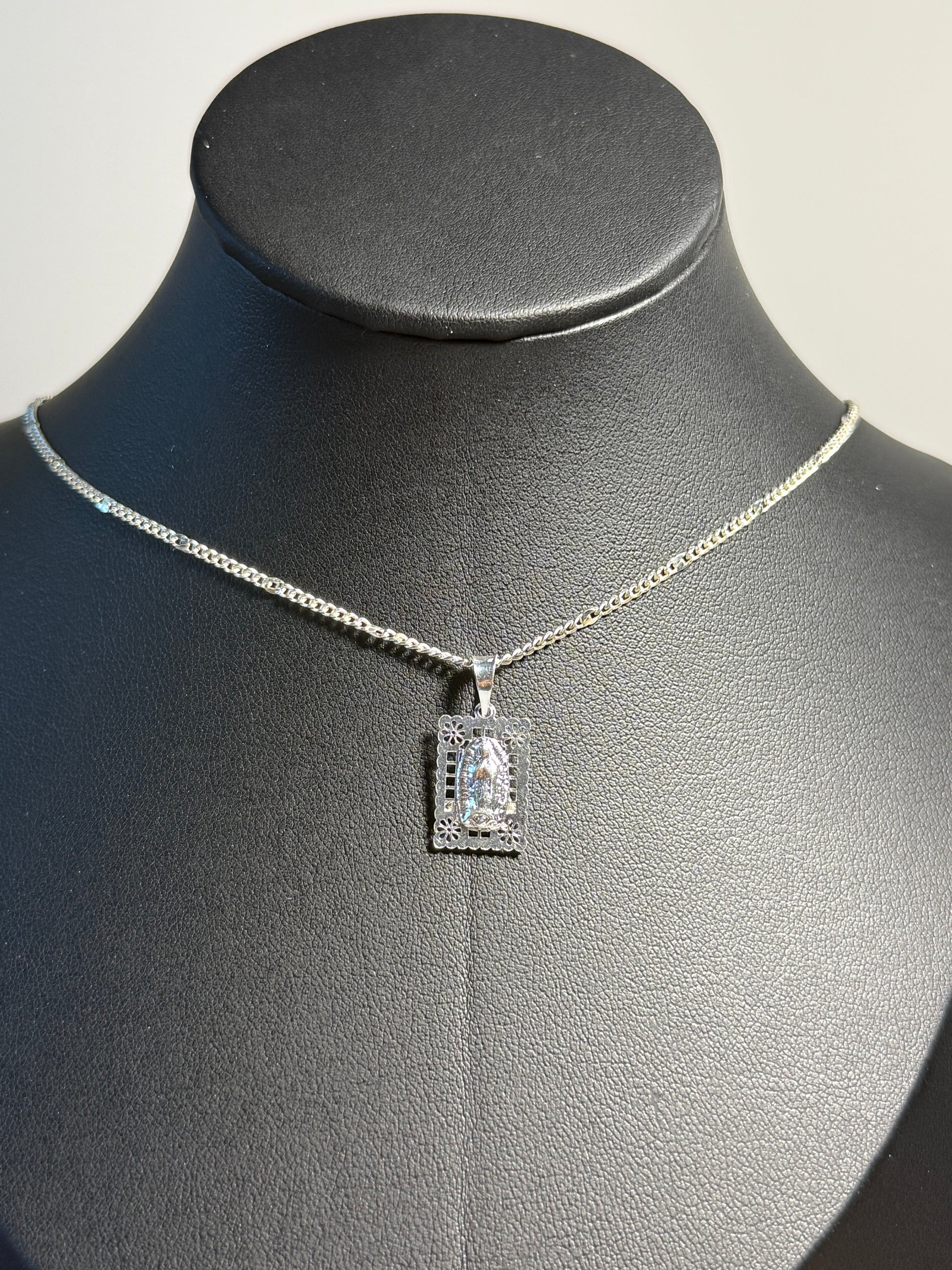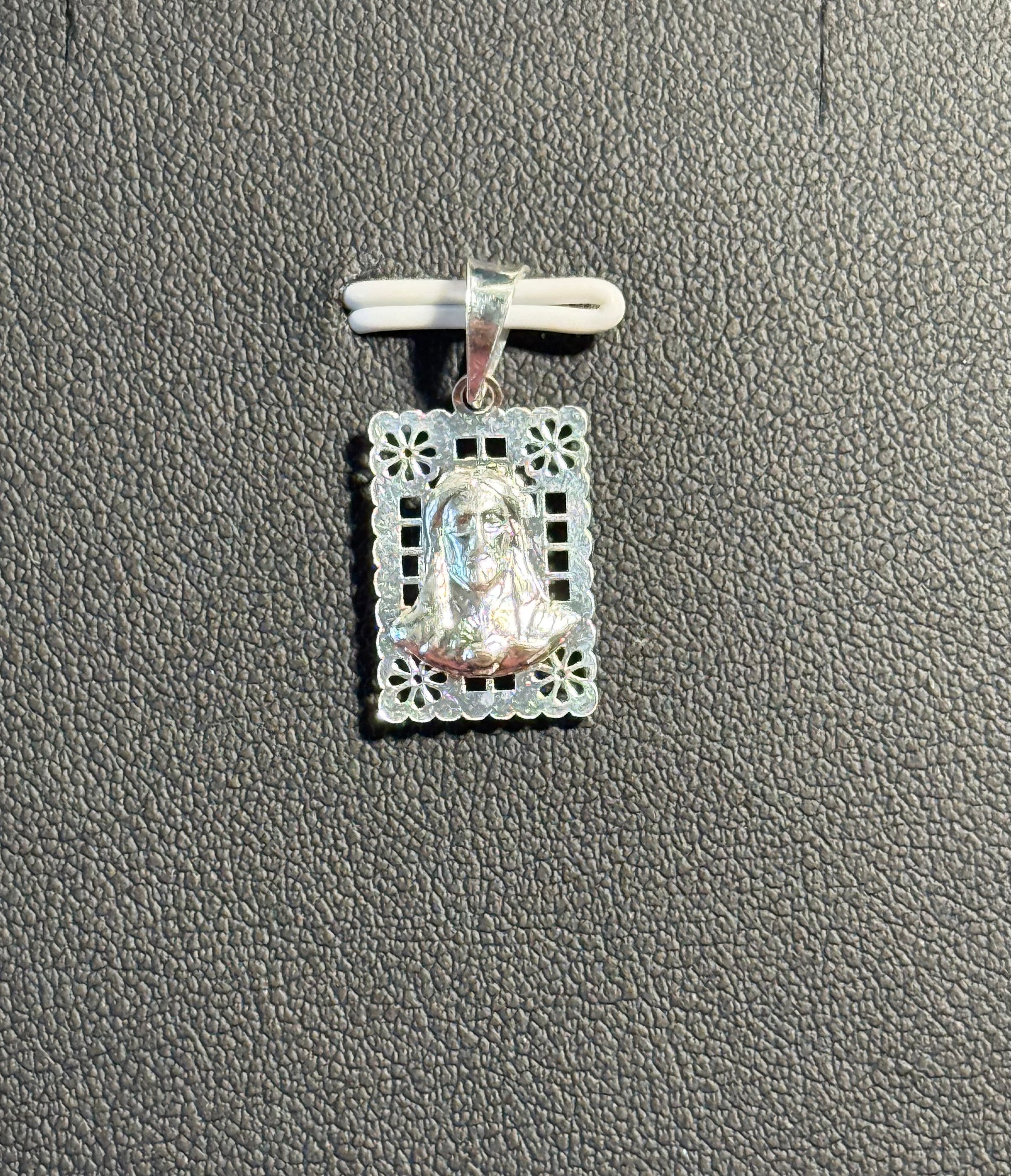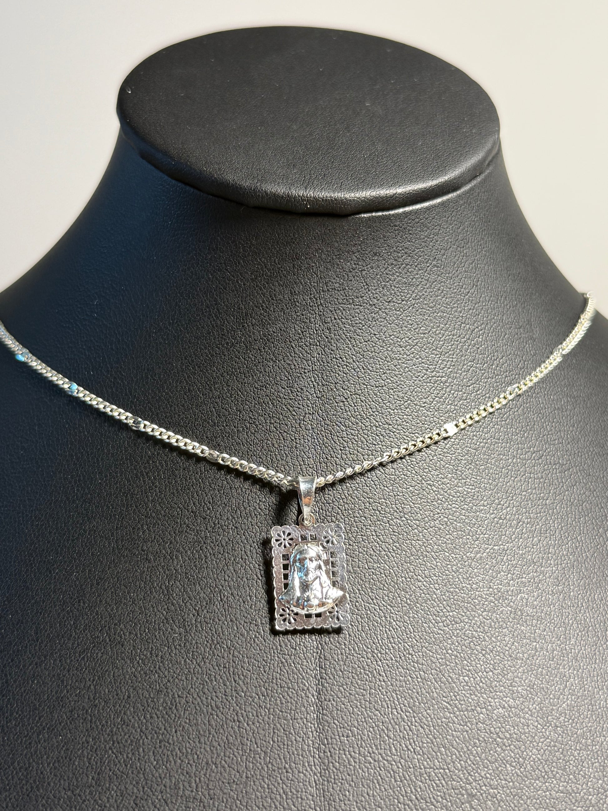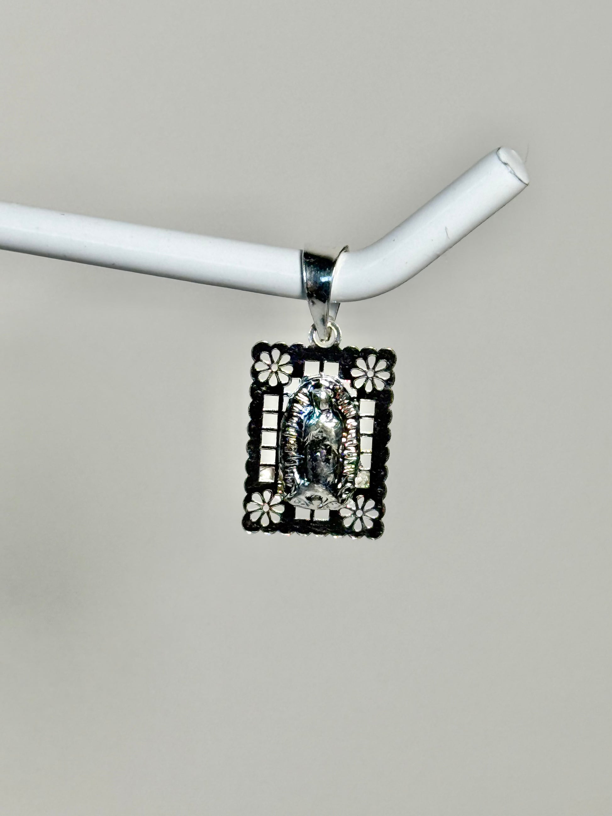 A perfect Mexican themed mini pendant with Virgin Mary and Jesus. This double sided pendant is on beautifully crafted on papel picado.