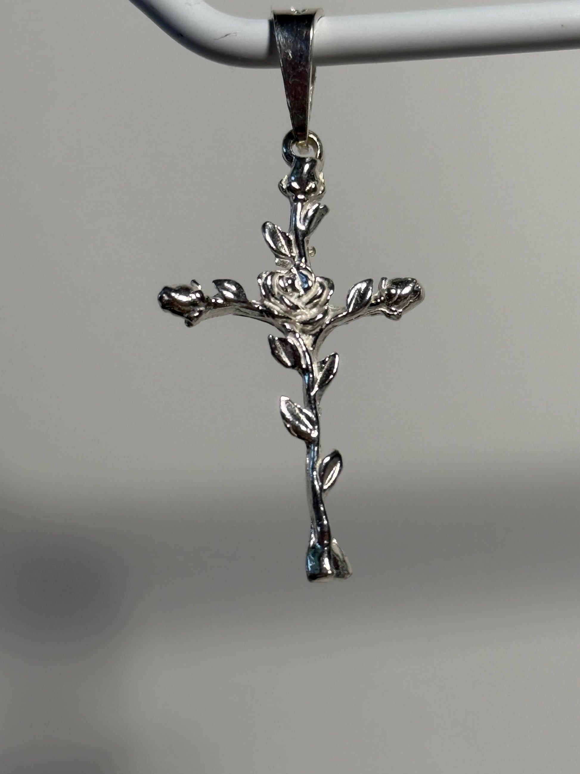 A rose intertwined into a cross. This is a beautiful unique piece to wear with any style necklace.